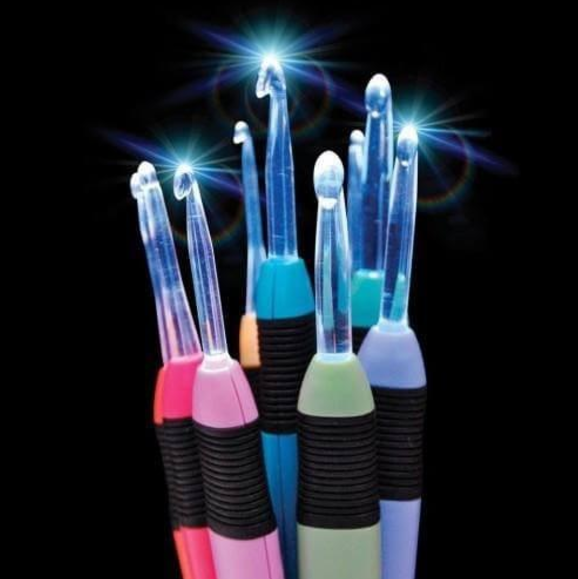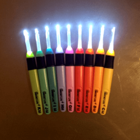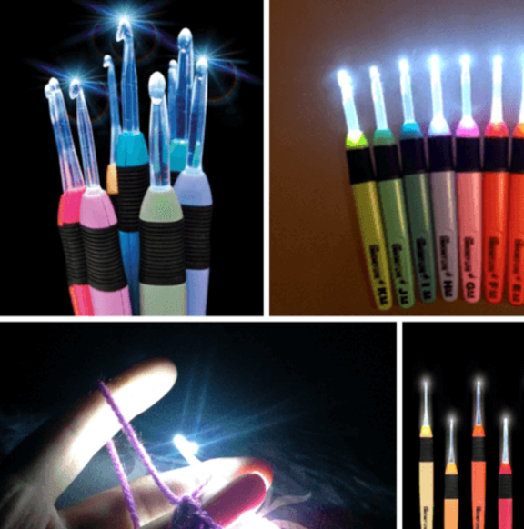 Crochet light up hooks can help you work on dark yarns and in dimly lit spaces. This crochet hook emits appropriate light from the tip and base. It is a lightweight hook--battery-operated with an on/off switch strategically located at the bottom (as in a pen). Get these light up hooks for a more efficient and longer crocheting time!