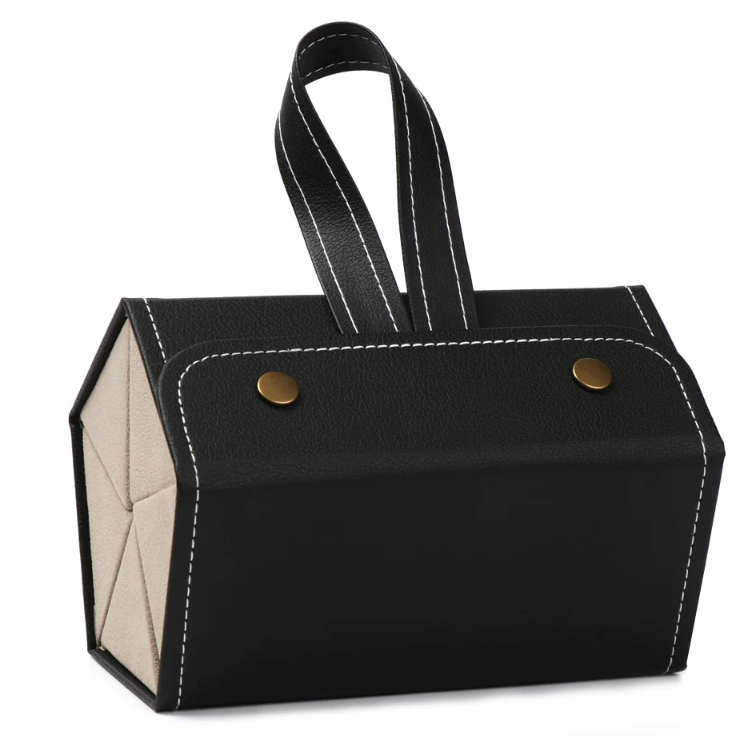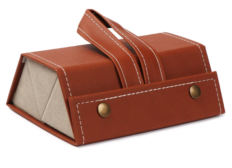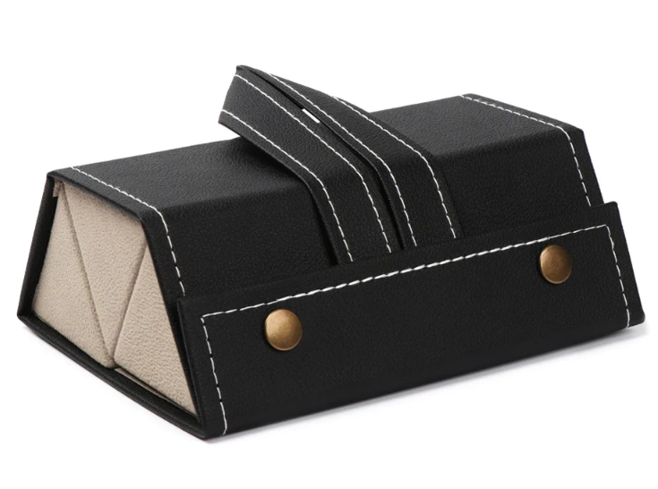 The Eye-Wear Wallet is the best place to store your glasses. It has multiple slots, a ring at the top, and a stylish display that can be seen in any room. You can also easily take it with you wherever you go as it can be rolled up into a pentagonal box and neatly placed in your suitcase, wallet, handbag, or backpack.
