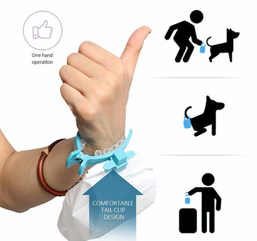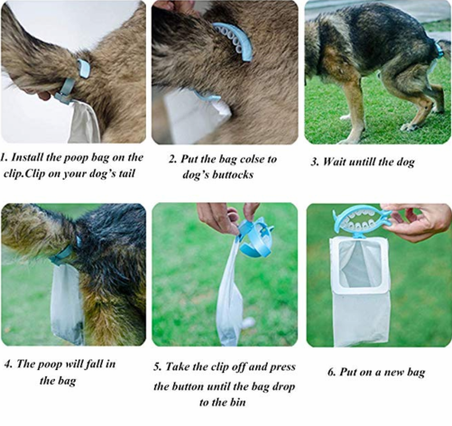 A disposable collection bag hangs below the clip. The bags are made of thin plastic which is light yet durable enough to prevent leakage, and not bulky for the dog.